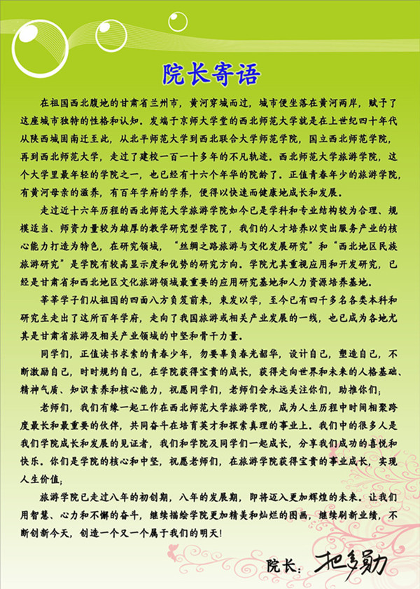 永利yl23411集团官网是西北地区普通高校中最早成立的专业永利yl23411集团官网,是西北地区知名、在全国有影响的文化与旅游人才培养、科学研究和服务文化与旅游产业发展的重要基地。学院本着“学科建设与人才培养立学院,应用研究与服务社会求发展”的办院宗旨,立足于甘肃,服务西北,为甘肃乃至全国文化与旅游产业输送了大量的专业人才。学院以专业设置全、人才培养层次高、社会服务能力强等特色在全国旅游院校和西北旅游业界中享有盛誉。