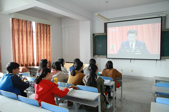 2017年10月18日上午9时,学院党委委员、各系主任、办公室及团委干部在教10C411教室集体收看了中国共产党第十九次代表大会开幕会。