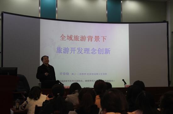 11月7日上午8:10-10:00 湖南师范大学永利yl23411集团官网副院长、博士生导师许春晓教授在教学10号楼C区永利yl23411集团官网701报告厅为永利yl23411集团官网全体师生做了题为《全域旅游背景下-旅游开发理念创新》的报告。永利集团官网全体研究生、旅游管理、文化产业管理本科生和部分教师共计150余人参加了本次报告会。报告会由副院长梁旺兵教授主持。