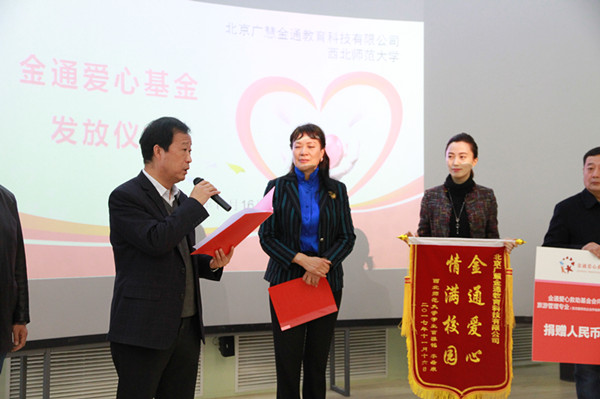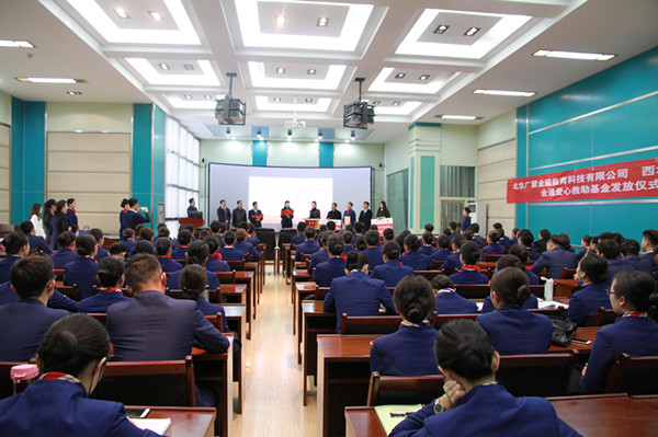 2017年11月16日,北京广慧金通教育科技有限公司金通爱心救助基金发放仪式在永利yl23411集团官网举行。金通爱心救助基金会副理事长王小娟,永利yl23411集团官网副校长张生勇,北京广慧金通教育科技有限公司教学管理部总经理、金通爱心救助基金会秘书长李青谦和永利yl23411集团官网负责人出席发放仪式。学校相关部门负责人、永利yl23411集团官网师生代表、受资助学生及家长等150人参加了捐助活动。此次金通爱心救助基金会共向旅游管理(航空服务校企合作)专业两名患重病学生捐助人民币10万元。
