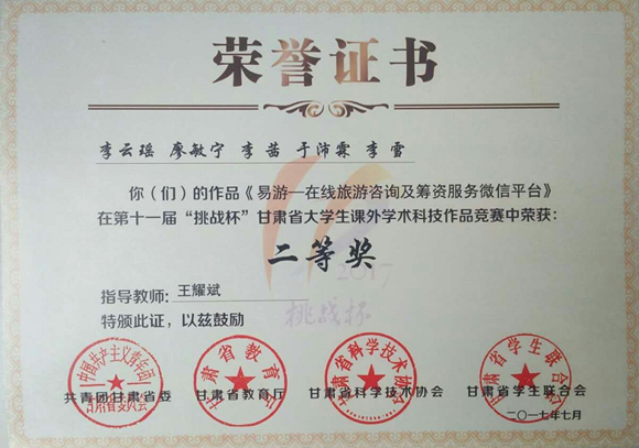 由王耀斌副教授指导、本科生李云瑶负责的《易游—在线旅游咨询及筹资服务微信平台》在第十一届“挑战杯”甘肃省大学生课外学术科技作品竞赛中荣获“二等奖”。