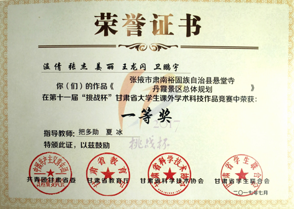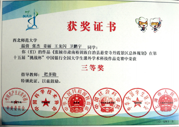 近日,在由永利集团官网把多勋教授和夏冰老师指导、旅游管理专业研究生温倩负责的《张掖市肃南裕固族自治县悬堂寺丹霞景区总体规划》在第十五届“挑战杯”中国银行全国大学生课外学术科技作品竞赛中荣获“三等奖”,同时在第十一届“挑战杯”甘肃省大学生课外学术科技作品竞赛中荣获“一等奖”。