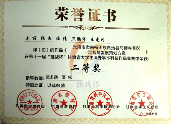 由把多勋教授和夏冰老师指导、旅游管理专业研究生姜丽负责的《张掖市肃南裕固族自治县马蹄寺景区运营与发展策划方案》在第十一届“挑战杯”甘肃省大学生课外学术科技作品竞赛中荣获“二等奖”。