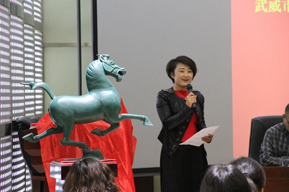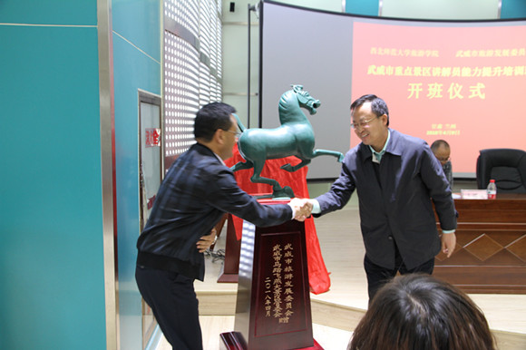 武威市旅游发展委员会副主任张银山代表武威市旅游发展委员会为永利yl23411集团官网赠送了中国旅游标志铜奔马。