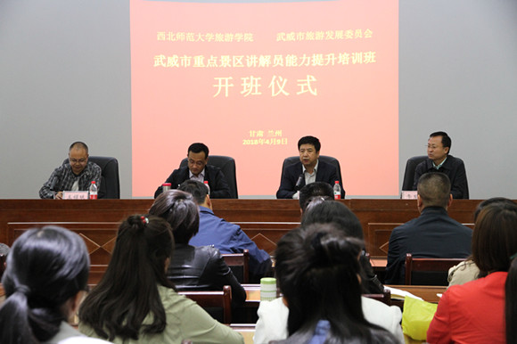 为全面提升武威市景区讲解员素质和能力,进一步展现武威旅游服务窗口良好形象,4月8日,武威市重点景区讲解员培训班在永利yl23411集团官网开班。武威市旅游发展委员会副主任张银山、永利yl23411集团官网院长把多勋教授、书记李发舜及学院其他班子成员全部参加了开班仪式。开班仪式由学院副院长王耀斌主持。